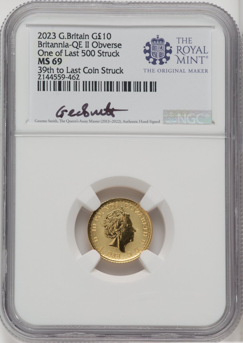 69 1000 Royal Succession (2023 G.B. G10 BRITANNIA-QE II OBVERSE 39TH TO LAST COIN STRUCK) (1000) – NGC