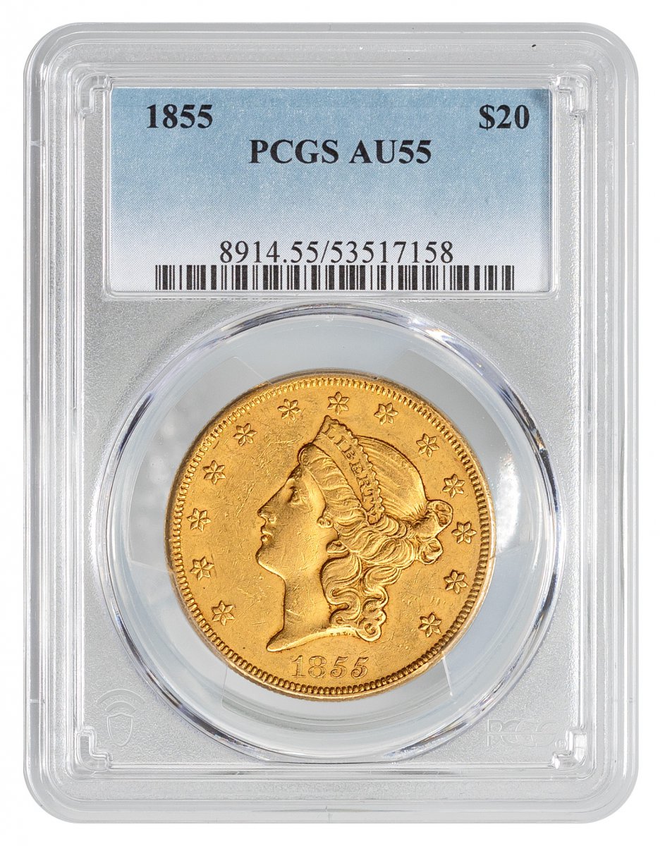 AU-55 1855-Liberty Head $20 – Type 1 No Motto – PCGS