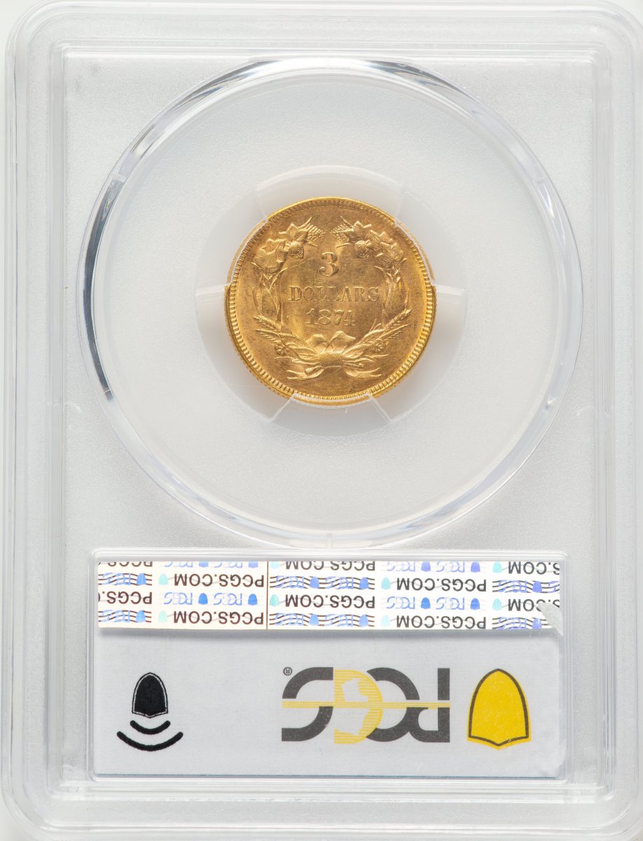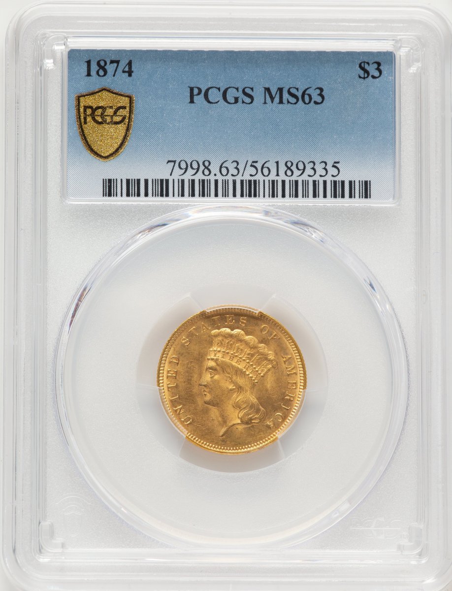 63 1874 Three Dollar Gold Pieces (1874 $3 PCGS Secure) (1874) – PCGS