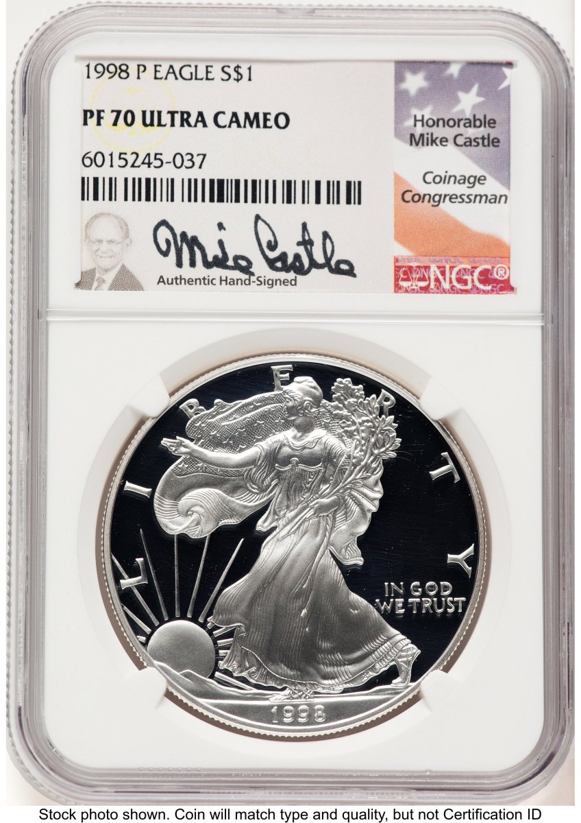 70 1998-P Modern Bullion Coins (1998-P Proof Silver Eagle 1 oz Mike Castle) (1998-P) – NGC