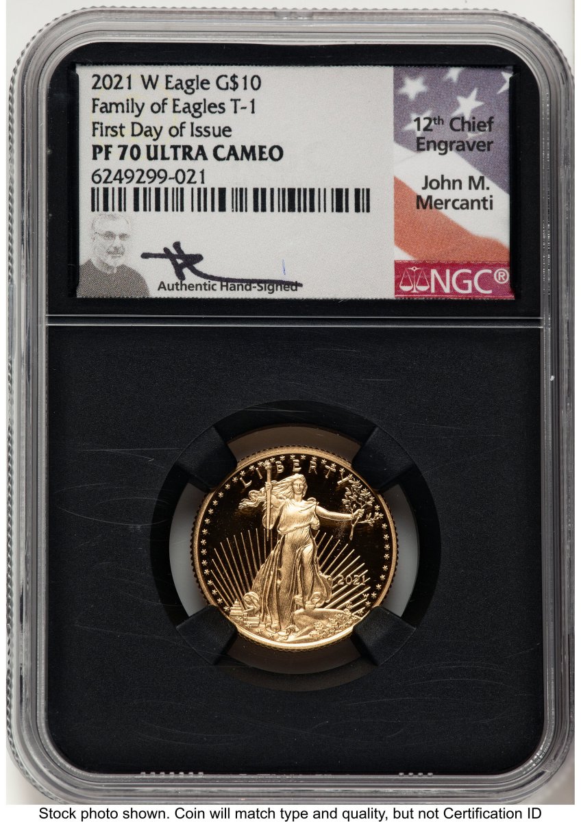 70 2021-W Modern Bullion Coins (2021-W Type 1 Proof Gold Eagle 1/4 oz FDI John Mercanti Blk Core) (2021-W) – NGC