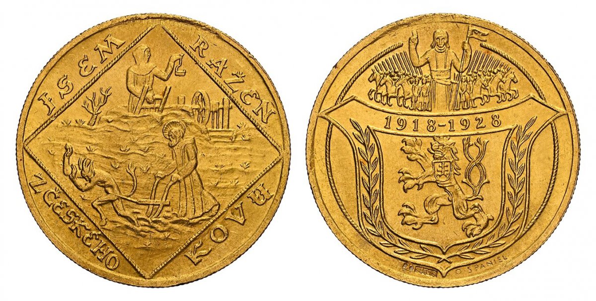 ![World Coins ("CZECHOSLOVAKIA. First Republic. (1918-1939). -1928 AV 4 Dukaten. NGC MS65. By Otakar Spaniel. Kremnitz. 13.95gm. Shield of arms with anniversary dates; stamped below [K] [9861/9]; signed O. Spaniel at lower right / A haloed Saint drives a plough pulled )](https://virtualfilestorage.s3.us-east-1.amazonaws.com/prc/2026/04/product_69d45214cb9c9_1-1.jpg)