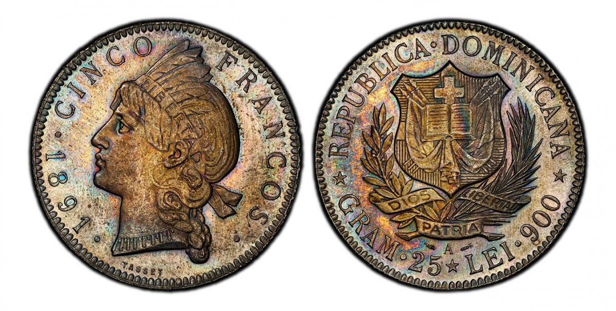63 World Coins (“DOMINICAN REPUBLIC. 1891-A AR 5 Francos. PCGS MS63. Dominican Republic Mint, Paris. Shielded arms within wreath / Head left. KM 12; Elizondo 1.