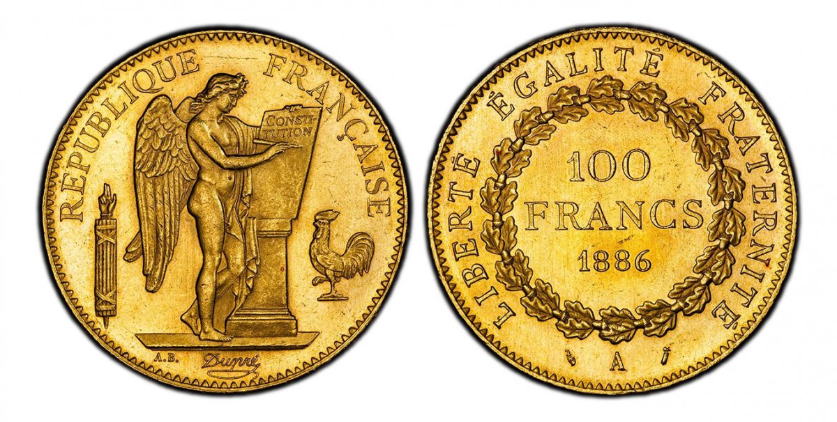 64 World Coins (“FRANCE. 1886-A AV 100 Francs. PCGS MS64. Paris. Edge: DIEU PROTEGE LA FRANCE. 35mm. 32.258gm. Standing Genius writing the Constitution, rooster on right, fasces on left / Denomination above date within circular wreath. KM 832; F-552; Gad.-1137.