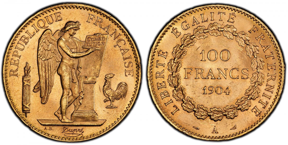 64 World Coins (“FRANCE. 1904-A AV 100 Francs. PCGS MS64. Paris. Edge: DIEU PROTEGE LA FRANCE. Standing Genius writing the Constitution, rooster on right, fasces on left / Denomination above date within circular wreath. KM 832; Friedberg 590; Mazard 1784; Schl.-415; Gad) – PCGS