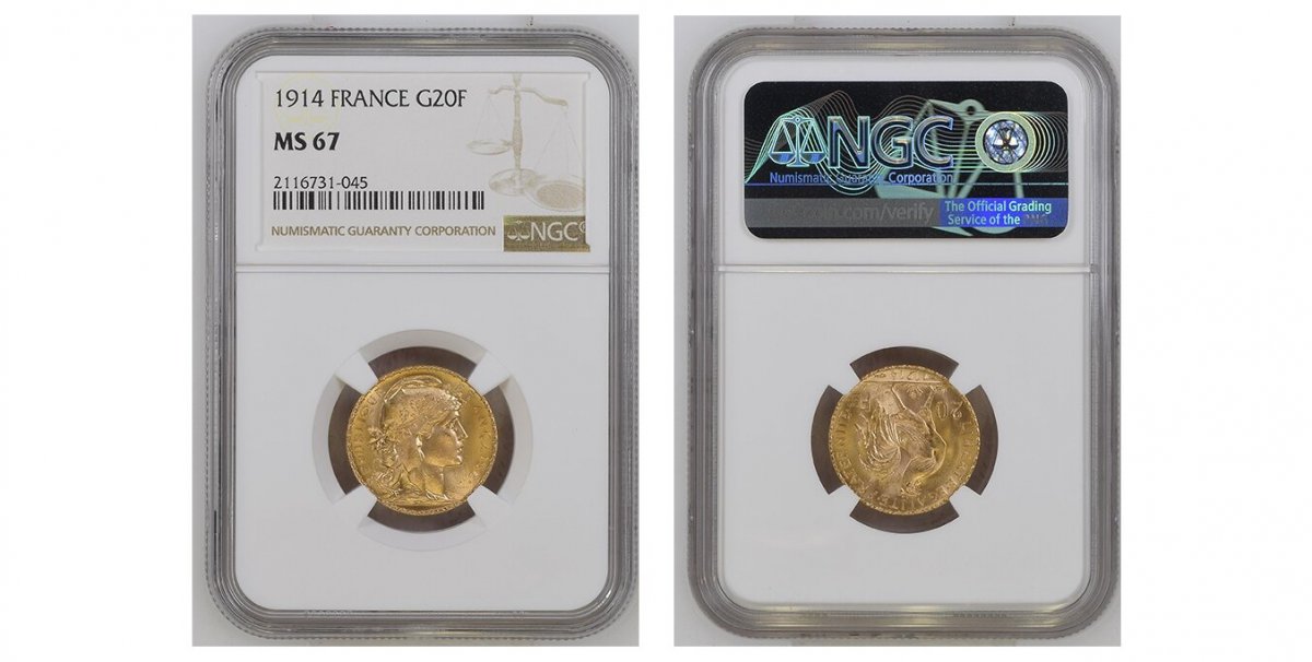 67 World Coins (“FRANCE. 1914 AV 20 Francs. NGC MS67. By Jules-Clément Chaplain. Edge: LIBERTE EGALITE FRATERNITE. 21mm. 6.4516gm. Oak leaf wreath encircles liberty head right / Rooster divides denomination, date below. KM 857.