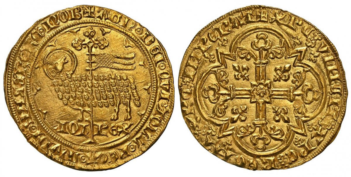 64 World Coins (“FRANCE. Jean II Le Bon. (King, 1350-1364). (1350-64) AV Mouton dOr. NGC MS64. 4.72gm. Lamb and cruciform staff with flying banner / Floriated cross in quadrilobe, fleurs de lis in angles. Friedberg 280; Duplessy 291; Ciani 354.