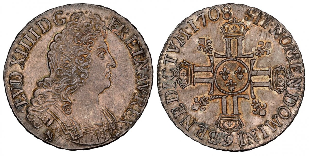 64 World Coins (“FRANCE. Louis XIV. (King, 1643-1715). 1708-(9) AR Ecu. NGC MS64. Rennes. Edge: DOMINE SALVVM FAC REGEM. 40mm. LVD · XIIII · D · G · FR · ET · NAV · REX ·. Armored bust right / SIT. NOMEN. DOMINI. BENEDICTVM (date). Crowned double Ls in cruciform, fleur) – NGC