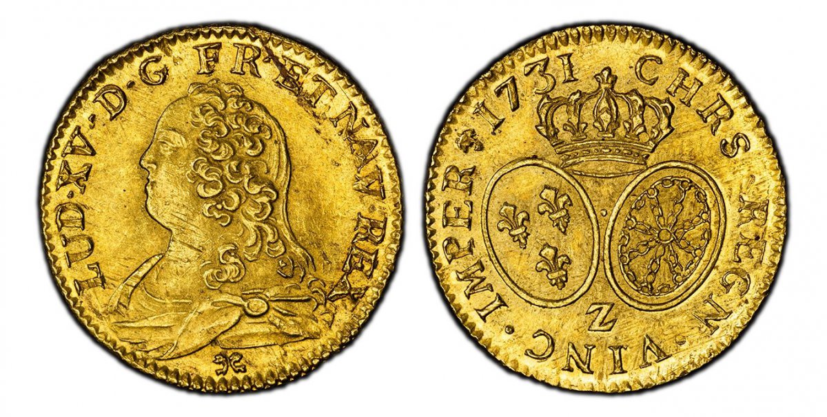 61 World Coins (“FRANCE. Louis XV. 1731-Z AV Louis dOr. PCGS MS61. Grenoble. LUD · XV · D · G · FR · ET · NAV · REX ·. Draped bust left / CHRS · REGN · VINC · IMPER ·. Crown above arms of France and Navarre. KM 489.25; Fr.-461; Dup.-1640; Gad.-340.