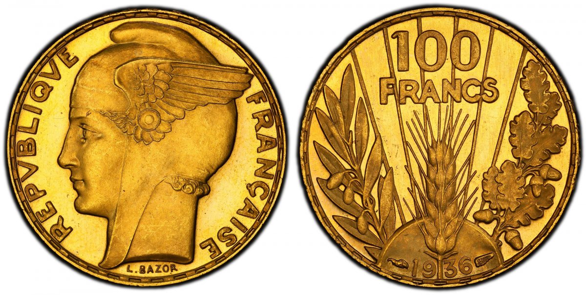 65 World Coins (.”FRANCE. Third Republic. (1870-1940). 1936 AV 100 Francs. PCGS PR65DCAM (Deep-Cameo). By L. Bazor. Paris. REPVBLIQVE FRANÇAISE. Winged head, left; signed below / 100 FRANCS. Denomination above grain sprig, date below, laurel and oak branches flank. KM 8) – PCGS