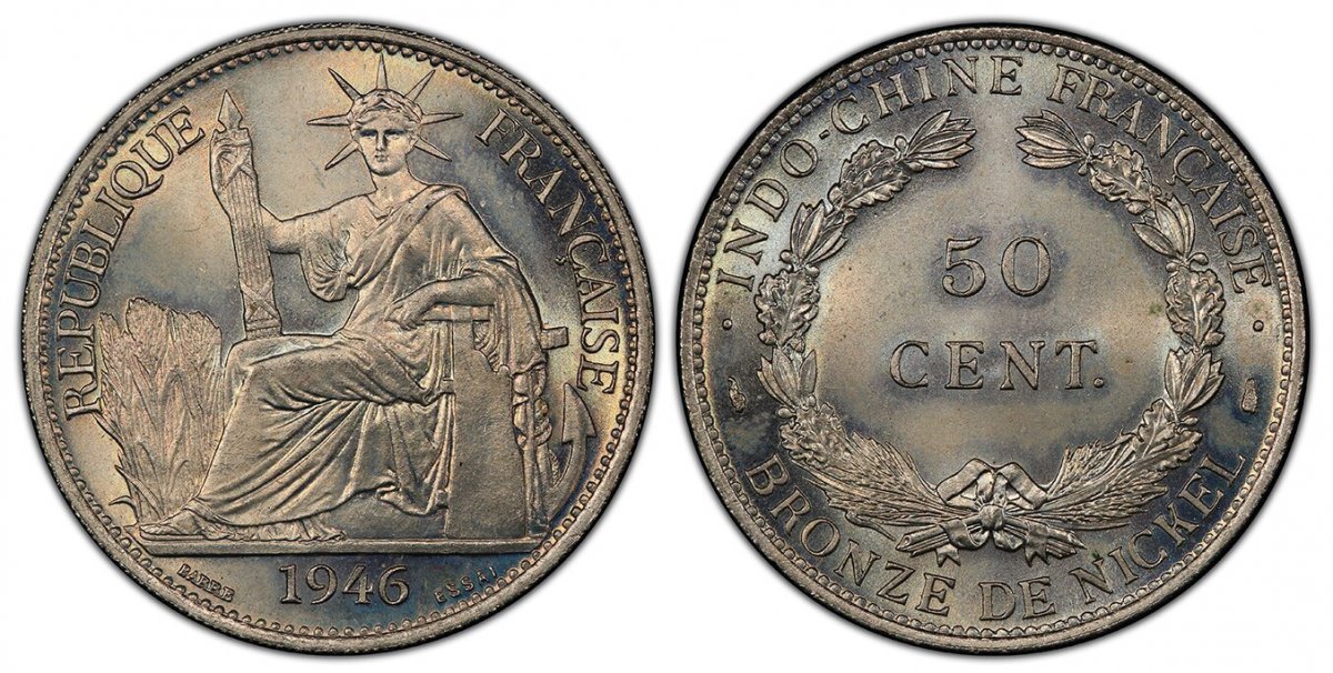 67 World Coins (“FRENCH INDO-CHINA. 1946-(a) Copper-Nickel Essai 50 Cents. PCGS SP67. Paris. Liberty seated, date below / BRONZE DE NICKEL. Denomination within wreath. KM E41; Lecompte 264.