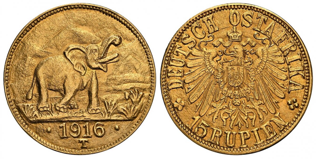 66 World Coins (“GERMAN EAST AFRICA. Wihelm II. 1916-T AV 15 Rupien. NGC MS66. Tabora. Crowned imperial eagle, right arabesque ends below “”T”” of “”OSTAFRIKA”” / Elephant roaring right above date. KM 16.1; Jaeger 728b.