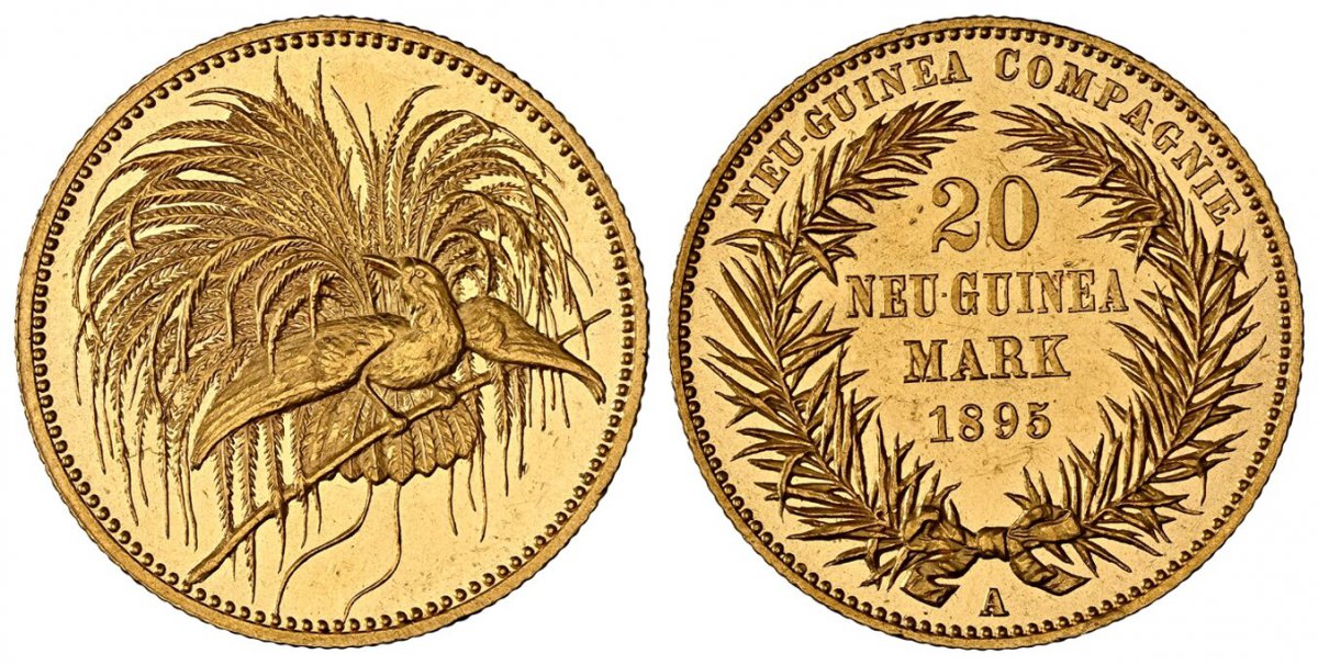 63 World Coins (“GERMAN NEW GUINEA. 1895-A AV 20 Mark. NGC MS63. Berlin. Denomination and date in palm wreath / Bird of Paradise. KM 9; Jaeger 709; Fr.-1.