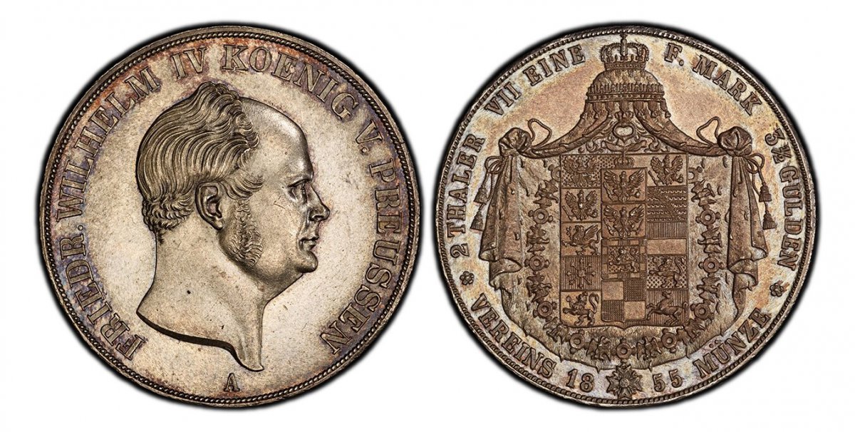 64 World Coins (.”GERMAN STATES. Prussia. Friedrich Wilhelm IV. 1855-A AR 2 Thaler, 3-1/2 Gulden. PCGS MS64. Berlin. Edge: Gott Mit Uns. 37.09gm. FRIEDR. WILHELM IV KOENIG V. PREUSSEN. Head right / 2 THALER VII EINE F. MARK 3 1/2 GULDEN * VEREINS date MUNZE. Arms within) – PCGS