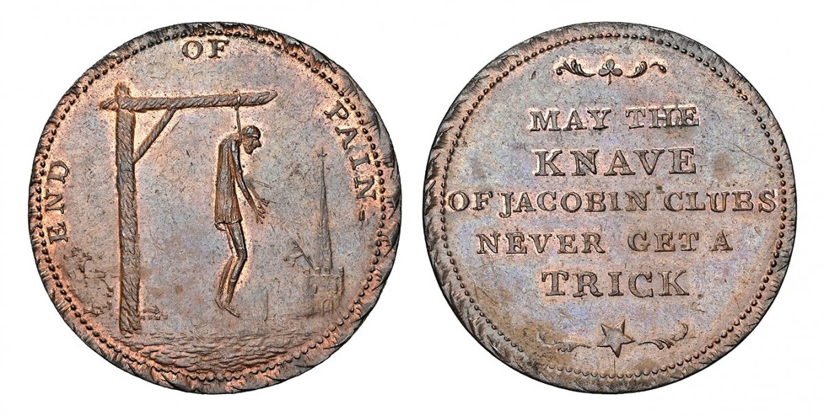 65 World Coins (.”GREAT BRITAIN. Middlesex, Spences. 18th. Century (ND) CU Halfpenny Token. NGC MS65BN (Brown). Edge: Plain. END OF PAIN. Man being hung from gallows / MAY THE KNAVE OF JACOBIN CLUBS NEVER GET A TRICK. Five lines of text. D&H 830a.