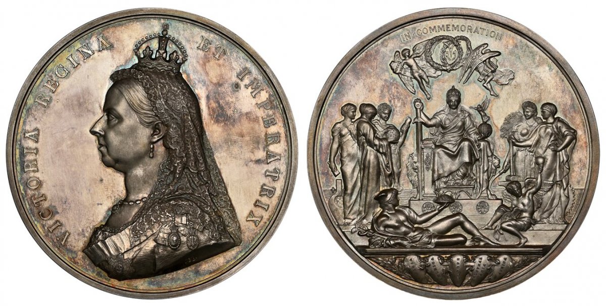 65 World Coins (.”GREAT BRITAIN. Victoria. (Queen, 1837-1901). ND (1887) AR Medal. NGC MS65. By J.E. Boehm and F. Leighton. Edge: Plain. VICTORIA REGINA ET IMPERATRIX. Crowned and veiled bust left, J.E.B. on truncation of bust / IN • COMMEMORATION. Victoria enthroned an) – NGC