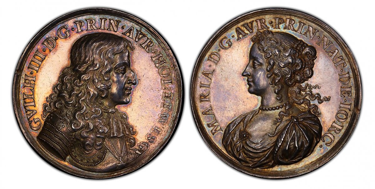 62 World Coins (.”GREAT BRITAIN. William III, of Orange. (King, 1689-1702). (1677) ND AR Medal. PGS MS62. By Nicholas Chevalier. Edge: Plain. 42mm. GVILH • III • D • G • PRIN • AVR • HOL • ET • WES • GV •. Armored bust of William III, right / MARIA • D • G • AVR • PRIN) – PCGS