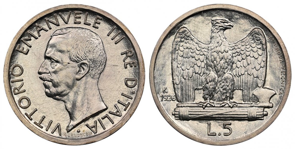 67 World Coins (.”ITALY. Vittorio Emanuele III. 1926-R AR Pattern 5 Lire. NGC MS67. Rome. Edge: *FERT*. Head left / Eagle with open wings standing on fascis. KM Pr38 (cf. KM 67.1); Pagani 226 (Prova Technica); Montenegro 213.